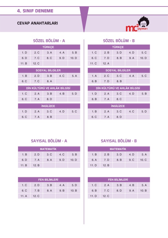 5. SINIFLARA ÖĞRENCİ SEÇME SINAVI CEVAP ANAHTARI