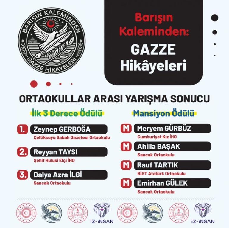 Barışın Kaleminden: "Gazze Hikâyeleri" yarışmasının da okulumuza üç ödül kazandıran öğrencilerimizi ve emeği geçen öğretmenlerimize teşekkür ederiz.